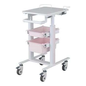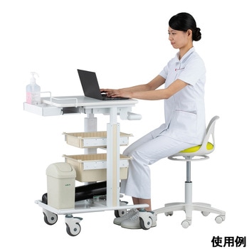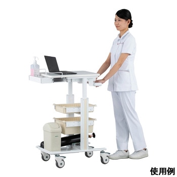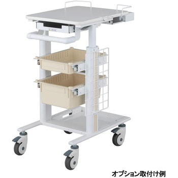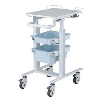 豊富なオプションにより使用用途に合ったカスタマイズが可能です。天板は450×580mmありノートPCを置いても十分な作業スペースがあります。天板はガススプリング補助により無段階で高さ調節が可能で手の小さい方でも操作しやすい形状のレバーです。全高850mmまで低くなるため天板高さ900mmのテーブル下に収納できます(テーブルの仕様により収納できない場合があります)。ハンドルは高さ約1mまで上がり背の高い人でもストレスなく搬送できます。キャスターは回転と旋回を止めるダブルストッパー付きで上から踏み込むことでロック・ロック解除を切り替え可能です。用途に合ったカスタマイズが可能。