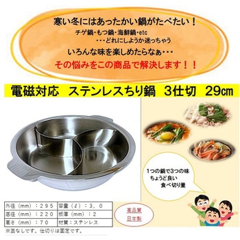 寒い冬には温かい鍋が食べたい。チゲ鍋・もつ鍋・海鮮鍋etc…いろんな味を楽しみたい。その悩みを解決します。1つの鍋で3種類の味、ちょうど良い食べ切り量。電磁調理器、ガス火など、さまざまな熱源に対応。蓋無しです。仕切は固定です。