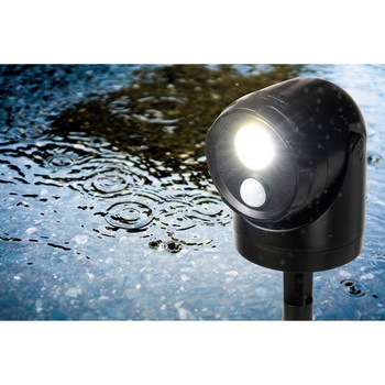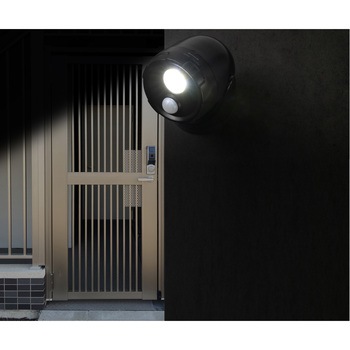 配線不要の便利な乾電池式でどこにでも設置ができる防犯センサースポットライトです。人感センサーを搭載、ライトのエリア内に人が居る事をセンサーが検知して450lmの光で警告。瞬時にパッと明るく点灯することで勝手口や玄関のセキュリティにつながります。IP65の防塵防水機能付きで屋外でも安心して使用できます。