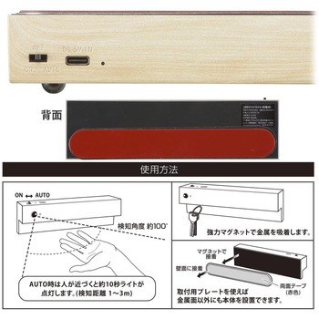 人感センサーと明暗センサーを搭載したLEDナイトライトです。高演色Ra95で自然な色合いの電球色光を照らします。強力マグネット内蔵で、簡単に設置できます。取付用プレートを使用すれば、金属面以外にも本体を設置できます。USB Type-C充電に対応し、AUTOモードでは長期間使用できます。