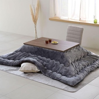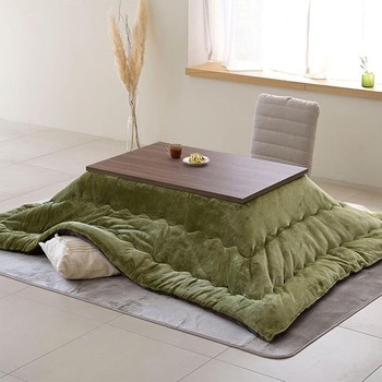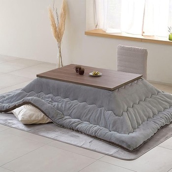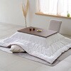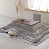 年中使えるこたつテーブル。新生活やひとり暮らしにぴったりなサイズ。ヒーターが発する遠赤外線で、ポカポカと身体の芯まで暖めます。ヒーターのでっぱりを抑えた薄型設計。こたつ本体にはコードを掛けるフックがついています。【こたつ布団】さらふわな肌触りのフランネル生地を両面に使用。ほこりの出にくい、ポリエステル綿をたっぷり2.0kg。取っ手付き収納袋付きでオフシーズンもコンパクトに収納。無地柄はリバーシブルで使用可能。
