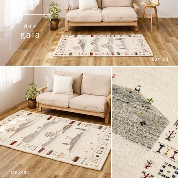 用途インドの職人によって一枚一枚、丁寧に織り上げられたギャッベラグマット。経糸を多く用いることで生まれる繊細な柄と、天然ウールならではの深みのある風合いが特長です。高密度に織り込まれたずっしりとした重厚感と、豊かなボリューム感を備え、踏みしめた瞬間には弾力のある心地よさを感じられます。ウールが多くの空気を含むため、夏はさらっと涼しく、冬は足元から暖かく、一年を通して快適に使用可能。吸湿・放湿性にも優れ、リビングや寝室、ソファ前など、くつろぎの空間に上質な落ち着きをもたらします。材質パイル部:ウ-ル100%色ガイア備考ホットカーペット対応、洗濯不可厚さ15mm寸法(cm)90×150機能-滑り止め効果なし内容量1個