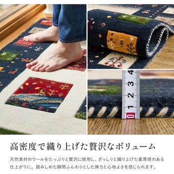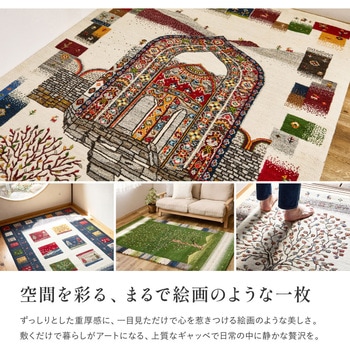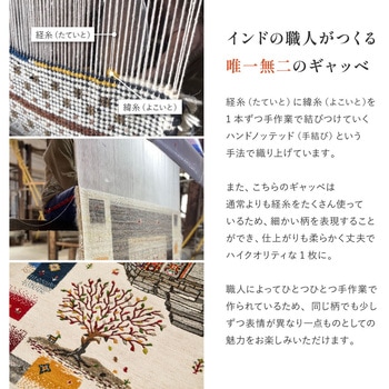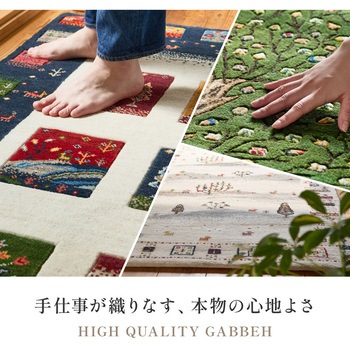 用途インドの職人によって一枚一枚、丁寧に織り上げられたギャッベラグマット。経糸を多く用いることで生まれる繊細な柄と、天然ウールならではの深みのある風合いが特長です。高密度に織り込まれたずっしりとした重厚感と、豊かなボリューム感を備え、踏みしめた瞬間には弾力のある心地よさを感じられます。ウールが多くの空気を含むため、夏はさらっと涼しく、冬は足元から暖かく、一年を通して快適に使用可能。吸湿・放湿性にも優れ、リビングや寝室、ソファ前など、くつろぎの空間に上質な落ち着きをもたらします。材質パイル部:ウ-ル100%色ツリー グリーン備考ホットカーペット対応、洗濯不可厚さ15mm寸法(cm)90×150機能-滑り止め効果なし内容量1個