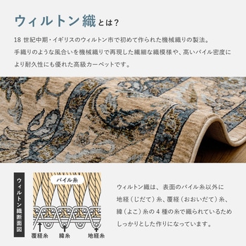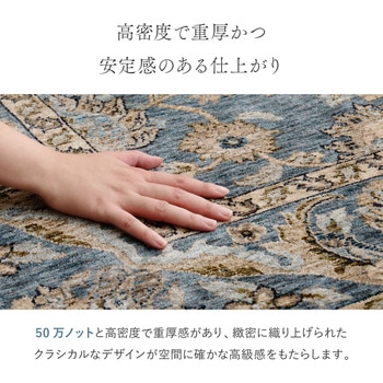 用途格式高い伝統柄と深みのある色合い、クラシカルなペルシャ調デザインをベースに、繊細な花柄モチーフを緻密に織り上たウィルトンラグ。500,000ノットの高密度なパイルは、短めの毛足ながらもしっかりとした厚みを感じられ、踏み心地の良さや長く使える耐久性も魅力です。床暖房やホットカーペットとの併用も可能で、冬は暖かく夏も快適に。気品あるデザインと高い実用性を兼ね備えたこのラグで、お部屋にワンランク上のインテリアコーディネートを取り入れてみませんか。材質表面:ポリエステル100% 、 500,000ノット色ブルー備考ホットカーペット対応、洗濯不可厚さ10mm寸法(cm)230×230機能-滑り止め効果なし内容量1個