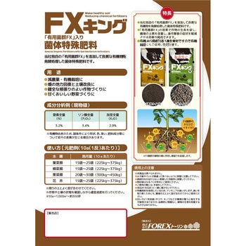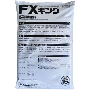 メーカー独自の「有用菌群FX」を添加して良質な有機物を発酵処理した菌体特殊肥料です。「有用菌群FX」の効果で作物の生長を促し、圃場の土質を改善し、連作障害の症状を軽減させる効果が期待できます。有機JAS規格別表1適合資材ですので有機栽培にもご使用いただけます。