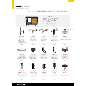 付属品差込クランプ(UDN6150)×2、差込Cクランプ(PT07K)×2、差込Cクランプ(PT09)×2、クランプ(TCX6210)×2、クランプ(T64217)×2、ストップ/拡張(T60630)×8、位置決め/サポート(T64211)×4、ストップ/サポート(T60304)×2、ストップ/サポート(T60305)×2、 Locate / Support(T64216)×8、位置決め/ロック(T65055)×10、位置決め/ロック(T64201)×2、位置決め(T64203)×4、位置決め(T64205)×4、スペーサー(T50737)×12セット内容ライノカート+66点治具キット付寸法(mm)【テーブル】1200×750質量(kg)230高さ(mm)【テーブル】800穴径(Φmm)16耐荷重(kg)680天板厚さ(mm)16穴ピッチ(mm)50×50RoHS指令(10物質対応)対応内容量1セット