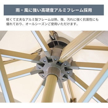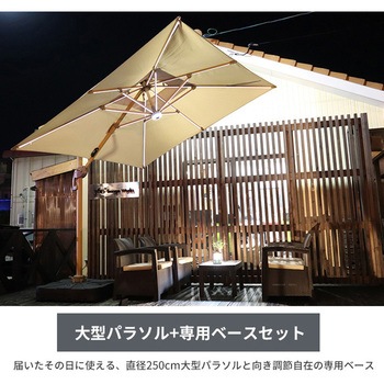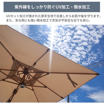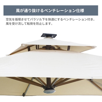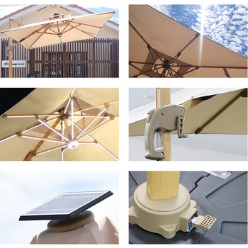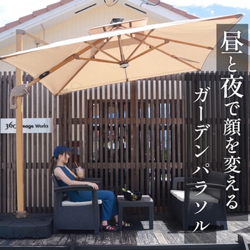 昼夜楽しめる、ライト付きガーデンパラソル!専用ベース付き&風の通り道をつくるベンチレーション仕様で転倒を防止。レバーの昇降でパラソルを開閉、ハンドルを回すことにより角度調節が可能。足元のペダルを踏むと360°の方向調整もできるため、日差しの向きに合わせられます。ライトの電力はUSBのほかにソーラーパネルからも充電可能です。