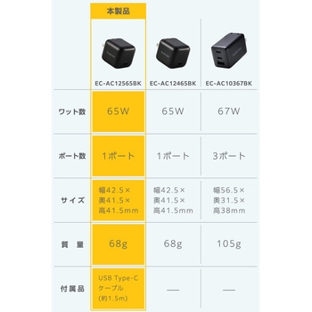 スマートフォンやタブレット、ノートパソコンをこれひとつで充電!USB Type-C(TM)ポートを搭載したAC充電器です。最大65W出力のUSB Power Deliveryに対応しています。外出や出張時の持ち運びにも便利なコンパクトサイズです。 ※USB Power Delivery 65W充電に対応した機種に限ります。