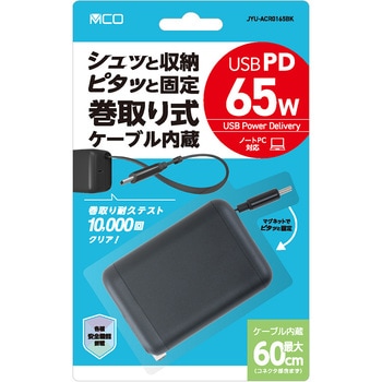 シュッと収納!ピタッと固定!巻取りケーブル付 USB PD 充電器巻取り収納テスト1万回をクリアした収納式Type-Cケーブルを内蔵。お手持ちのType-C充電ケーブルで使用可能なType-C 1ポート(最大65W出力)搭載。持ち運びに便利なコンパクトサイズ「過電流保護」「過電圧保護」「短絡保護」「温度保護」4つの安全保護機能搭載本体内部温度上昇時には自動的に出力を制御する、温度感知安全機能搭載。