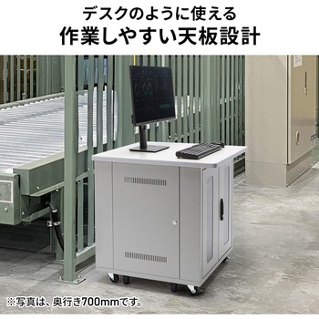 制御用PCや通信機器を安全かつ効率的に収納できる、19インチマウント付きデスク。奥行き800mm。