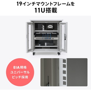 EIA規格に準拠した19インチマウントフレームを11U搭載し、サーバー機器やロボット制御用PCを整理して設置できます。※前方に19インチマウントフレームを装備しています。後方には装備しておりません。