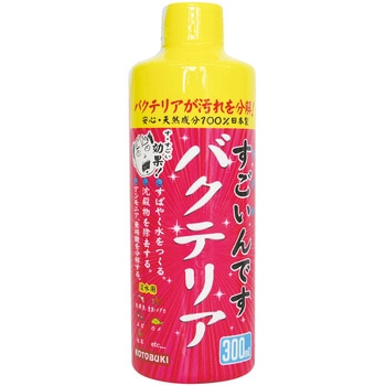 バクテリアが汚れを分解!お得用300mlが新登場!有害なアンモニアや亜硝酸を分解、除去し、すばやく水質を安定させます。水底に沈殿する有機物(残餌、排泄物、枯草など)を分解、除去します。すはやく水質を安定!すばやく水をつくる。