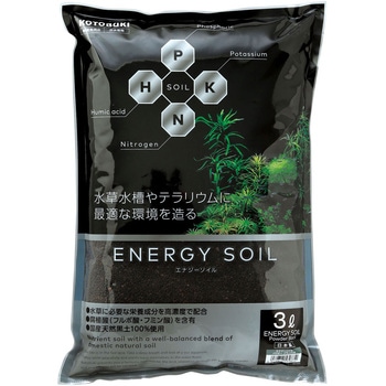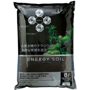 エナジーソイルは良質な国産天然黒土を原料に水草の成長に必要な窒素・カリウム成分やその他微量元素などを絶妙にブレンドした栄養系ソイルです。