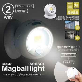ボール型ボディで乾電池使用タイプのセンサーライト。センサーライトとしても懐中電灯としても使用でき、マグネットや両面テープで簡単に設置可能。電気の通ってない暗所への設置や、廊下の足元灯など様々な場所で便利にご利用いただけます。