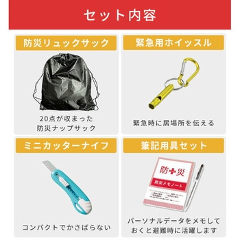ナップサック、緊急用ホイッスル、ミニカッターナイフ、筆記用具セット(ノート1冊、ボールペン1本)、マスク3枚、歯ブラシ3本、携帯トイレ3個、ポリ袋45L 3枚、紙皿3枚、プラカップ5個、スプーン・フォークセット、2WAY懐中電灯、ラバー手袋、レインポンチョ、アルミブランケット2個、エア枕、非常用給水バッグ5L、ラップ(30cm×20m)、ボディタオル、ティッシュ