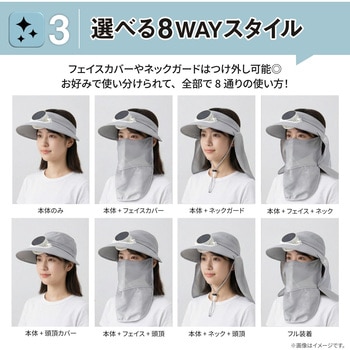 【外装:OPP袋】帽子のつばに小型ファンを搭載し、顔周りに送風可能/手ぶらで涼しく過ごせる/Type-C給電式/晴天時はソーラーパネルで駆動可能/3段階の風量調整/バッテリー残量表示モニター搭載/充電ケーブル(AtoC)付属/フェイスカバー・ネックガード・頭頂カバーを着脱して8通りの組み合わせが可能