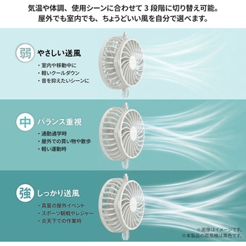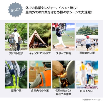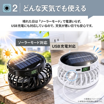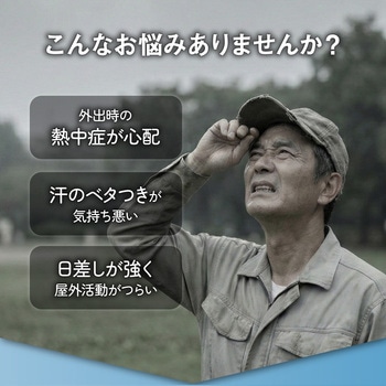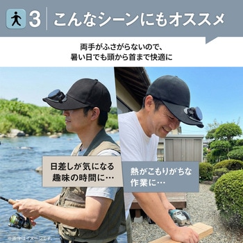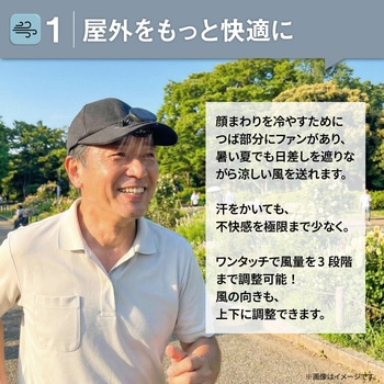 付属品充電ケーブル×1(USB Type-A⇔USB Type-C)、保証書付取扱説明書材質PP材質、ポリエステル繊維、鉄、電子部品色ブラック質量(g)約159サイズ(cm)【つば】約11、回転数(min-1[r.p.m])6500(最大)電源充電式リチウムイオン電池定格入力電圧(V)5風量調整3段階(+ソーラーモード)充電時間(時間)約3モード【ソーラー】内蔵バッテリーを消費せず、ファンを駆動することが可能です。1.ソーラーモードボタンを長押しします。※室内や曇雨天時には使用できません。2.ソーラーパネルに十分な太陽光が直射されると⚡;マークが緑に点灯し、ファンが駆動します。※太陽光の強弱により、ファンの風量が上下します。3.終了時は、電源ボタンを4回押す。またはソーラーパネルに太陽光が直射しない状態にしてください。バッテリー容量(mAh)1000充電方式ソーラーファン側面にあるUSB Type-Cポートに充電ケーブルのUSB Type-Cコネクタを接続し、ACアダプタなどの電源供給可能なType-AポートにType-Aコネクタを接続します。バッテリー残量表示が1.00%になったら充電可能です。、※本製品を充電しながらの使用はおやめください。バッテリー劣化の原因になります。※接続機器の電源供給能力が低い場合、充電時間が極端に長くなることがあります。※完全放電すると充電できなくなる場合があります。3か月に一度程度の充電をおすすめします。※付属の充電ケーブル以外は使用しないでください。※他の充電ケーブルでは正しく充電できない場合があります。使用後の手入方法1.帽子からソーラーファンを取り外します。※指をはさまないようご注意ください。2.つば部分を避けて水洗いしてください。※洗剤は使わないでください。※必ずファンをお取り外しの上でお手入れをお願い致します。3.ご使用再開時は、ソーラーファンの取り付け部が帽子のはめ込み部にカチッと音がするまではめれば装着完了です。連続動作時間最大14時間(風量1段階)※使用環境により異なります頭囲(cm)約53~56深さ(cm)【頭周り】10内容量1個