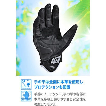 手の甲には硬質ハードナックルプロテクターを装備し、万が一の衝撃に配慮した設計です。手のひらには本革を採用し、耐摩耗性を高めながら、繊細なスロットル操作にも対応するグリップ力を確保しました。