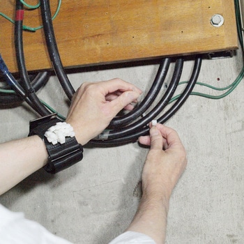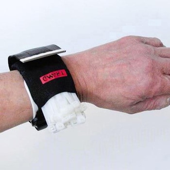 手首に巻き付けられるリストバンドに、複数のケーブルタイを差し込んで作業・持ち運びできるケーブルタイホルダーです。