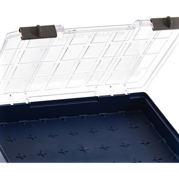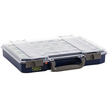 ふたはスライド式ロック付きです。蓋に溝がついており、内容物がトレーを超えることを防ぎます。開閉状態が一目でわかる便利な認識ラベル付き、ロック解錠時はオレンジ色のラベルが見えます。ふた部分は透明です。一部ややスモークがかかっていますが、外から中身は、ほぼ判別可能です。別売アクセサリー『パーツケーストレー55』シリーズで内容物に合わせたカスタマイズが可能です(品番:100274、114578、114653、114585、105590、114592、114608、105583、103695、105576)。