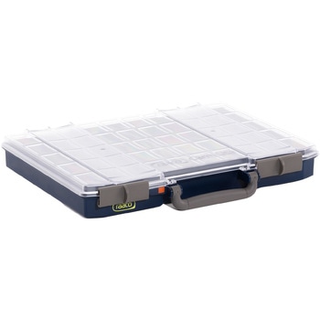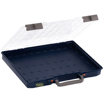 ふたはスライド式ロック付きです。蓋に溝がついており、内容物がトレーを超えることを防ぎます。開閉状態が一目でわかる便利な認識ラベル付(ロック解錠時はオレンジ色のラベルが見えます。)ふた部分は透明(一部ややスモークがかかっています)。外から中身は、ほぼ判別可能です。別売アクセサリー『パーツケーストレー55』シリーズで内容物に合わせたカスタマイズが可能です(品番:100274、114578、114653、114585、105590、114592、114608、105583、103695、105576)。