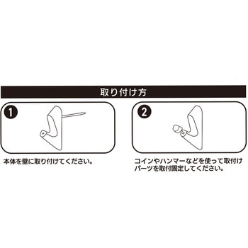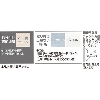 抜き跡が小さく目立ちにくい。石こうボード用フック。クロスしたピンでしっかり固定。プッシュタイプは付属の押しピン形状なのでかんたんに取り付けできます。それ以外の製品はコインなどで取り付けしてください。屋内専用