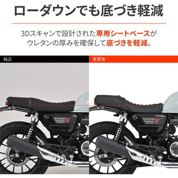シート高はノーマル比で約-25mmとダウン量は少なめながら、ライダー側の座面幅を狭めて肩もなだらかに落とすとことで、足つき性も向上。