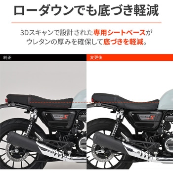 純正に近い形状ながらライダー部分を削ってスリムにし、座面を約25mmダウンさせたローダウンシート。