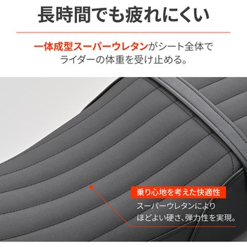 一体成型のスーパーウレタンの硬さ・弾力性により、ライダーの体重をシート全体で受け止めて長時間座っていても疲れにくい。