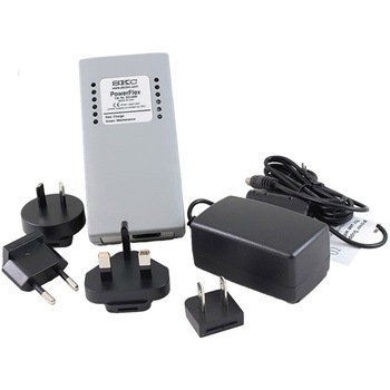 PowerFlex(R) Single battery chargerは、100-240 V対応で電源および電源コードが付属し、使用するポンプに応じた専用ケーブルは別途購入が必要です。対応ケーブルは、AirChek(R) 2000用がCat. No. 223-1001、Universal(5セル)用がCat. No. 223-1002、Universal(4セル、MSHA)用がCat. No. 223-1003、AirChek 52用がCat. No. 223-1004、222 Series Low Flow用がCat. No. 223-1005で、本製品は米国製ポンプモデル専用であり、EXおよびATEX認証モデルには対応していません。