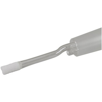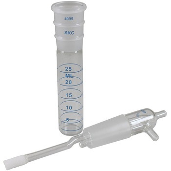 ガラス製ミジェットインピンジャーで、捕集液のこぼれを抑える構造を採用しており、容量25 ml、フリット付きノズルを備えています。