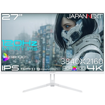 27インチのIPSパネルを搭載した、4K(3840×2160)解像度のゲーミングモニターです。120Hzの高速リフレッシュレート、1ms(MPRT)の高速応答速度により、より滑らかな映像表示を可能にし、ゲームプレイに最適です。3つのゲームモードを搭載しFPSなどゲームに合わせて変更可能です。本体カラーにホワイトを採用。モニターベゼルやスタンドも白となっており、爽やかでおしゃれな空間を演出したい場合や、デバイスを白で統一したい場合に最適です。さらに、付属のケーブル類にもホワイトカラーを採用。最大輝度400cd/m2、sRGB:100%の広色域に対応した液晶パネルは、HDR400相当の性能を持ち、コンテンツを色鮮やかに映し出します。HDR(ハイダイナミックレンジ)は、明るい部分も暗い部分もくっきり表現。可変リフレッシュレート(VRR)にも対応し、ティアリングやスタッタリングを軽減し、よりなめらかにVRR対応ゲームを表示します。インターフェイスはHDMI 2.1×2、DisplayPort 1.4×2を搭載。75×75mmのVESAマウントに対応、モニターアームやモニタースタンドなどへの取り付けが可能です。2W×2のステレオスピーカーを内蔵。本製品には、2年間のメーカー保証が付きます。