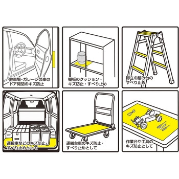 脚立の踏み台の滑り止めや、運搬台車・ワゴンの荷台の滑り止め・キズ防止、パレットの保護などに最適です。ご家庭では、ガレージの壁に貼って車のドア開閉時のキズ防止や、棚板のクッション材としてもご使用いただけます。作業台や工具の保護にも便利です
