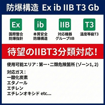 IIB T3分類に対応したことで、これまで防爆ファン付きウェアを使用できなかった一酸化炭素、エタノール、エチレン、エチレンオキシド等を使用している化学プラント等(ゾーン1のエリア)でも使用することができます