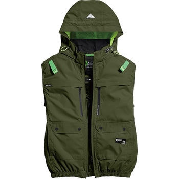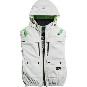 遮熱効果を発揮する裏チタンコーティング(遮熱ランクS45)UVカット(UPF50+)マイクロリップに耐久撥水加工を追加。着脱可能フードと風抜け抜群のワイドネックを一体化。熱中症対策に配慮した実用的な3ヵ所の保冷剤ポケット