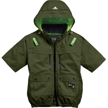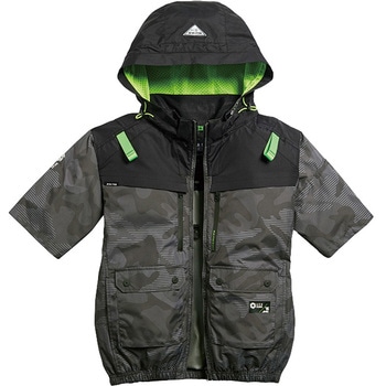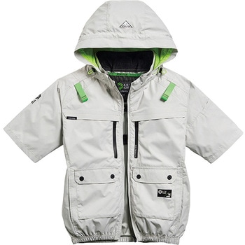 遮熱効果を発揮する裏チタンコーティング(遮熱ランクS45)UVカット(UPF50+)マイクロリップに耐久撥水加工を追加。着脱可能フードと風抜け抜群のワイドネックを一体化。熱中症対策に配慮した実用的な3ヵ所の保冷剤ポケット