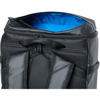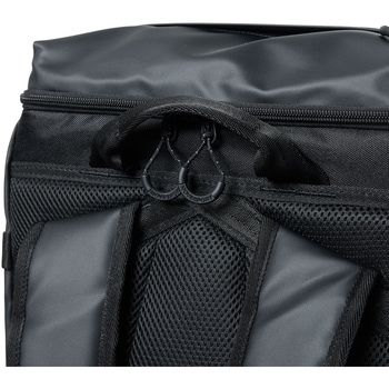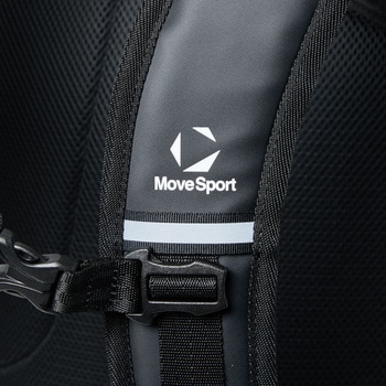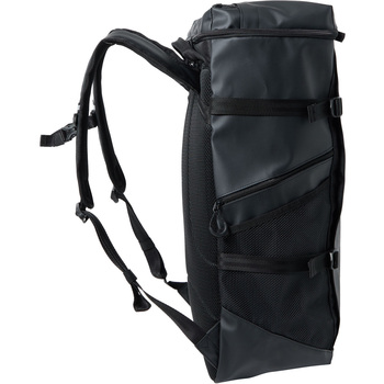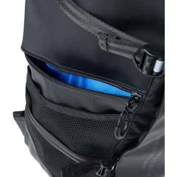 総容量40Lのスクエアバックパック。水を染み込みにくくするために、PVC加工を施した生地を本体に使用しています。メインルームにはクッション性のあるPC/タブレットポケットとマチ付きのアウトポケットのW構造の内ポケットを搭載しており、重いアイテムを背中側に収納することで、肩への負担を軽減します。 本体内側にメッシュの吊りポケットを、両サイドにはファスナーポケット、500mlのペットボトルの収納も可能なメッシュポケット、アクセス便利な蓋部ポケットと充実の収納力です。あまり荷物を入れない時は、両サイドのベルトで容量の調節が可能です。背面にメッシュ素材を採用し、快適な背負い心地で、チェストベルトを装着すればより安定したフィット感で着用できます。肩にフィットする形状のショルダーハーネス構造で、両サイドにリフレクターを搭載しています。オリジナルロゴ入りの裏地には抗菌防臭加工を施しています。