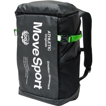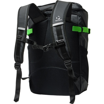 総容量30Lのスクエアバックパック。水を染み込みにくくするために、PVC加工を施した生地を本体に使用しています。シューズケースも収納可能な大きめのミドルルームがあり、メインルームにはクッション性のあるPC/タブレットポケットを搭載しており、重いアイテムを背中側に収納することで、肩への負担を軽減します。本体内側にメッシュの吊りポケットを、両サイドには500mlのペットボトルの収納も可能なメッシュポケットを、さらにアクセス便利な蓋部ポケットを搭載し、充実の収納力です。あまり荷物を入れない時は、両サイドのベルトで容量の調節が可能です。背面にメッシュ素材を採用し、快適な背負い心地で、チェストベルトを装着すればより安定したフィット感で着用できます。肩にフィットする形状のショルダーハーネス構造で、両サイドにリフレクターを搭載しています。オリジナルロゴ入りの裏地には抗菌防臭加工を施しています。