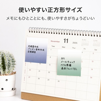 やさしい色合いの4色展開デスクに置くだけで、ちょっとおしゃれな気分に。グラデーションカラーが、メモ時間をちょっと特別に書く瞬間に、ほんの少しのときめきを。しっかり貼れて、きれいにはがせる強粘着でも、はがした跡が気にならない。ルーズリーフにも、ノートにもぴったり使いやすい正方形サイズメモにもひとことにも、使いやすさがちょうどいい。