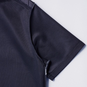 通気性に優れた透け感皆無のダブルフェイスメッシュ。耐久性と形態安定感に優れるヘビーウェイトストレッチ。ワークシーンでの実用性を高める立衿・肩刺子仕様