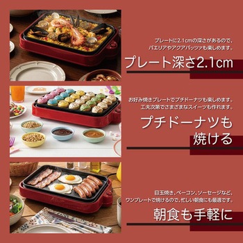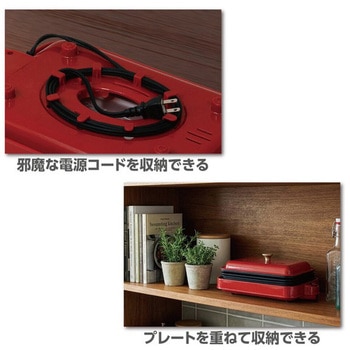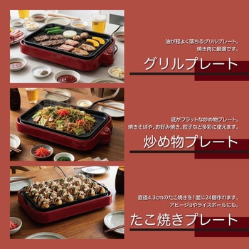 食卓が華やぐレッドボディ、グリルプレート、たこ焼きプレート、炒めものプレートと3種のプレートがセットになったホットプレートです。プレートは3枚重ねて、電源コードは本体裏に収納できるので、収納もスッキリ。サーモスタッド、温度ヒューズの安全装置を備え、操作はON/OFFだけの簡単操作で誰にでも使いやすい仕様です。