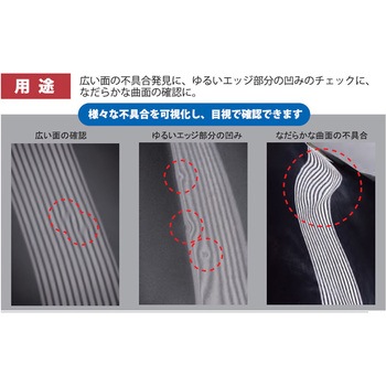 プレートの模様を対象物に投影することにより、凹みや歪みが見つけやすくなります。既存のライトスタンド類に装着可能です。つまみネジで固定しているので、用意に着脱できます。これまでの目視検査用ライト用ラインプレートに比べ、より広範囲を一度に検査することができます。