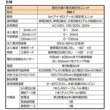 付属品注入電流出力線1本(LANケーブル・・1m・黒色)、補助アース棒1本(クリップ付・1m・緑色)、単3乾電池4本(動作確認用)、取扱説明書1部、携帯用ケース1個適合【電路】単相2線式、単相3線式、三相3線式(デルタ結線のみ)型式RM-1質量(kg)約0.25品名Ior測定用ユニット種類警報器、計測器周波数(Hz)【注入電流】50/60(正弦波)電源単3乾電池4本使用温度範囲0~40℃ 85%RH以下(結露のないこと)定格電圧AC100V、100V/200V、200V角度(°)【注入電流 単相モード】線間電圧位相に対し、-90 ±5、【注入電流 三相モード】線間電圧位相に対し、-180 ±10センサー【電圧位相検出センサー】外形Φ6~Φ26mmまでの絶縁電線(8~200mm2)をクランプ可能名称計測器連続使用可能時間約30時間(アルカリ乾電池・出力電流100mA)の場合使用周囲温度(℃)0~40(ただし、氷結・結露のないこと)外形寸法縦(mm)165可変範囲【注入電流 2mAレンジ】0~2mA、【注入電流 20mAレンジ】0~20mA、【注入電流 100mAレンジ】0~100mA外形寸法横(mm)70外形深さ(mm)26内容量1台