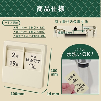 買い替え不要のパネル式万年カレンダーどんな空間にも馴染む3色展開ブラック/ホワイト/アイボリーを採用卓上で邪魔にならないコンパクトサイズ10cm×10cmの手のひらサイズです。3通りから選べる設置方法卓上置き、マグネット、吊り下げの3種類の設置方法が可能です。全12種の伝言メッセージパネル