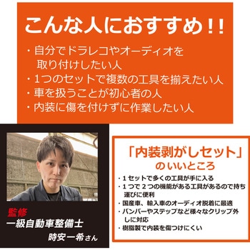 取説付き(カラー画像)初心者でも安心!こだわりの13点セット!【内張り剥がしセットのいいところ】1セットで多くの工具が揃う1つで2つの機能がある工具があるので持ち運びに便利国産車、輸入車のオーディオ脱着に最適バンパーやステップなど様々なクリップ外しに対応樹脂製で内装を傷つけにくい【こんな人におすすめ】自分でドラレコやオーディオを取付したい1つのセットで複数の工具を揃えたい車を扱うのが初心者の人内装に傷を付けずに作業したい人