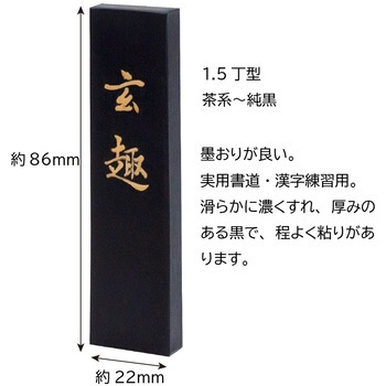 1.5丁型。茶系~純黒。墨おりが良い。実用書道・漢字練習用。滑らかに濃くすれ、厚みのある黒で、程よく粘りがあります。