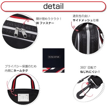 付属のショルダーベルトで2ウェイバッグに!ダブルファスナーで開閉しやすい!全開できるため、中身の出し入れが簡単!サイドは通気性のあるメッシュ生地!ネームラベル付き(個人情報に配慮してバッグの内側に縫い付け)!