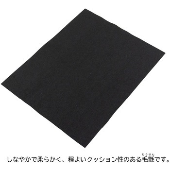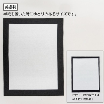 しなやかで柔らかい毛氈です。クッション性があり、文字を書く際にすべりにくく、しっかりとした書き心地です。机上など平らな場所で書くのに十分な2mmの厚みがあります。半紙を置いた時にゆとりのあるサイズです。