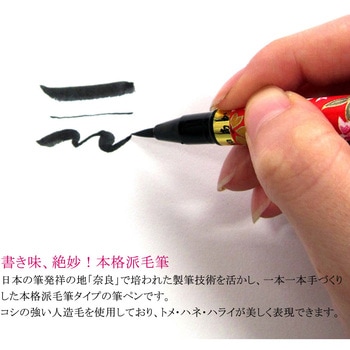 雅な京友禅柄の和紙で装飾した”ハレの日に似合う”筆ペン。伝統の「色と形」が織りなす洗練されたデザインに、日本の美を再発見!書き味、絶妙!本格派毛筆。奈良筆の製筆技術を活かし、一本一本手づくりした”本格派毛筆”。コシの強い人造毛を使用しており、トメ・ハネ・ハライが美しく表現できます。 ※水性染料インク