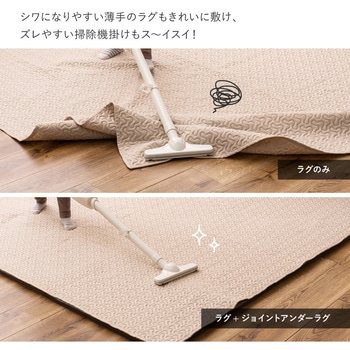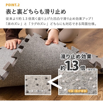 今お使いのラグやマットの下に敷くだけ!サイズも自由に変えられるジョイント式のアンダーラグ。約2cmの厚みのしっかり高密度の低反発ウレタンが、薄手のラグでももっちりふかふかな踏み心地に。子供がバタバタ走る音や、おもちゃで遊ぶ音など防音対策や、衝撃吸収で転倒時のケガ防止にも効果的です。両面滑り止め仕様で、従来の1.3倍(メーカー比)の滑り止め効果のある球体型の滑り止め付き。ジョイント式、カットもできるから大きいラグからコンパクトなマットまで幅広くお使いいただけます。